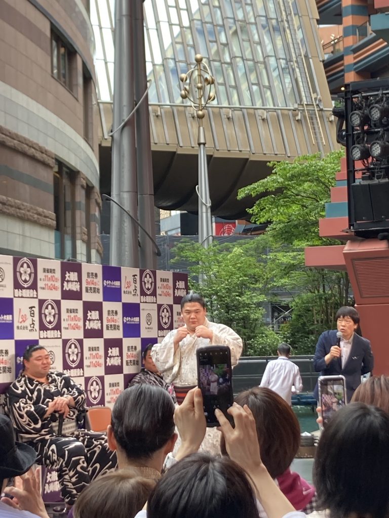 歌唱後は力士にそれぞれ九州場所の抱負や意気込みを聞き、また九州場所担当部長、浅香山親方からもご挨拶をいただき、お楽しみ企画はこれにて終了となりました。